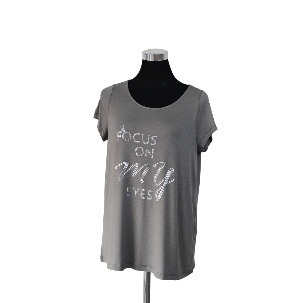 Graues LUXUSLASHES® T-Shirt mit Swarovski Steinen und dem Schriftzug "FOCUS OMN my EYES" in perfekter Passform.