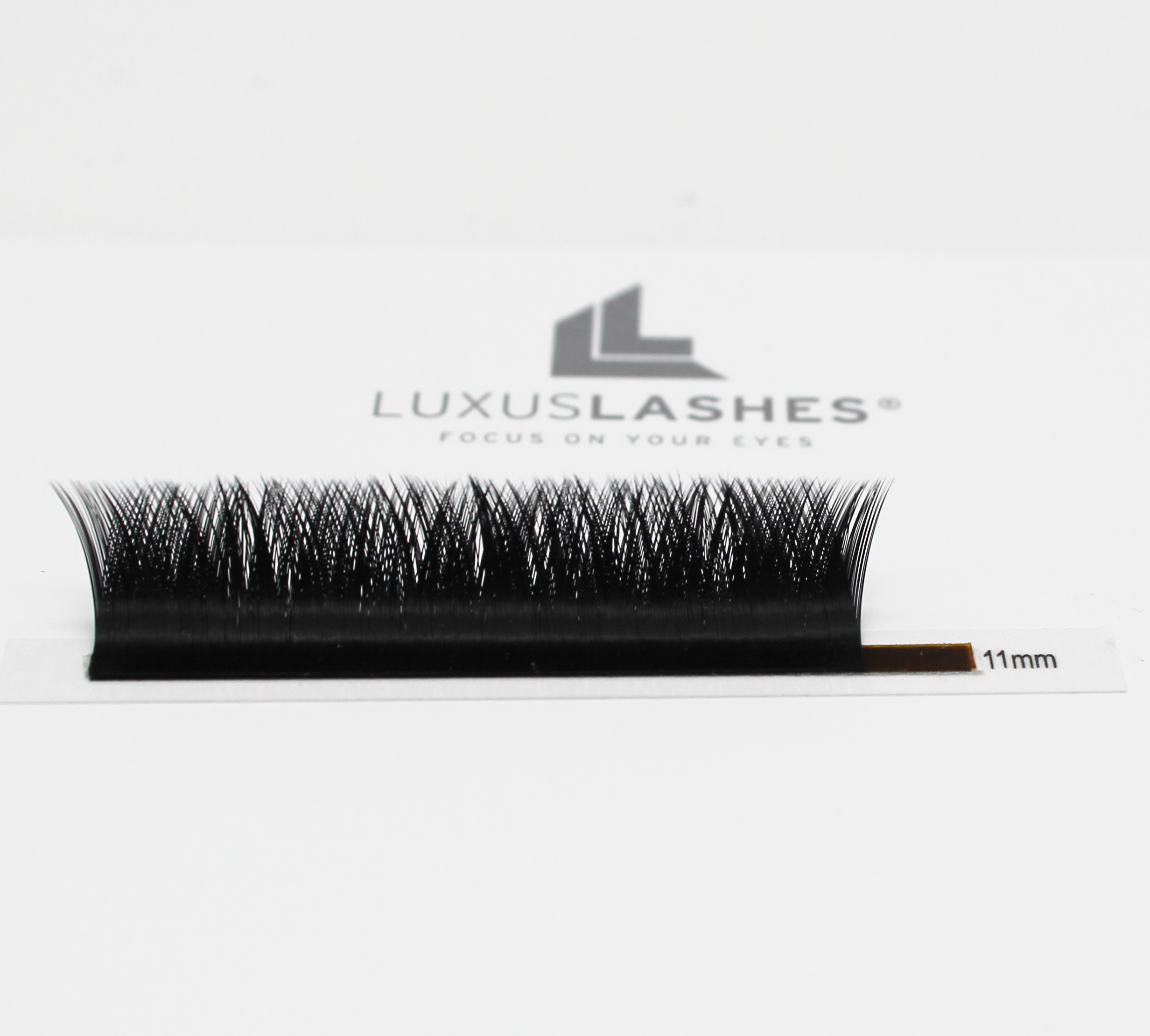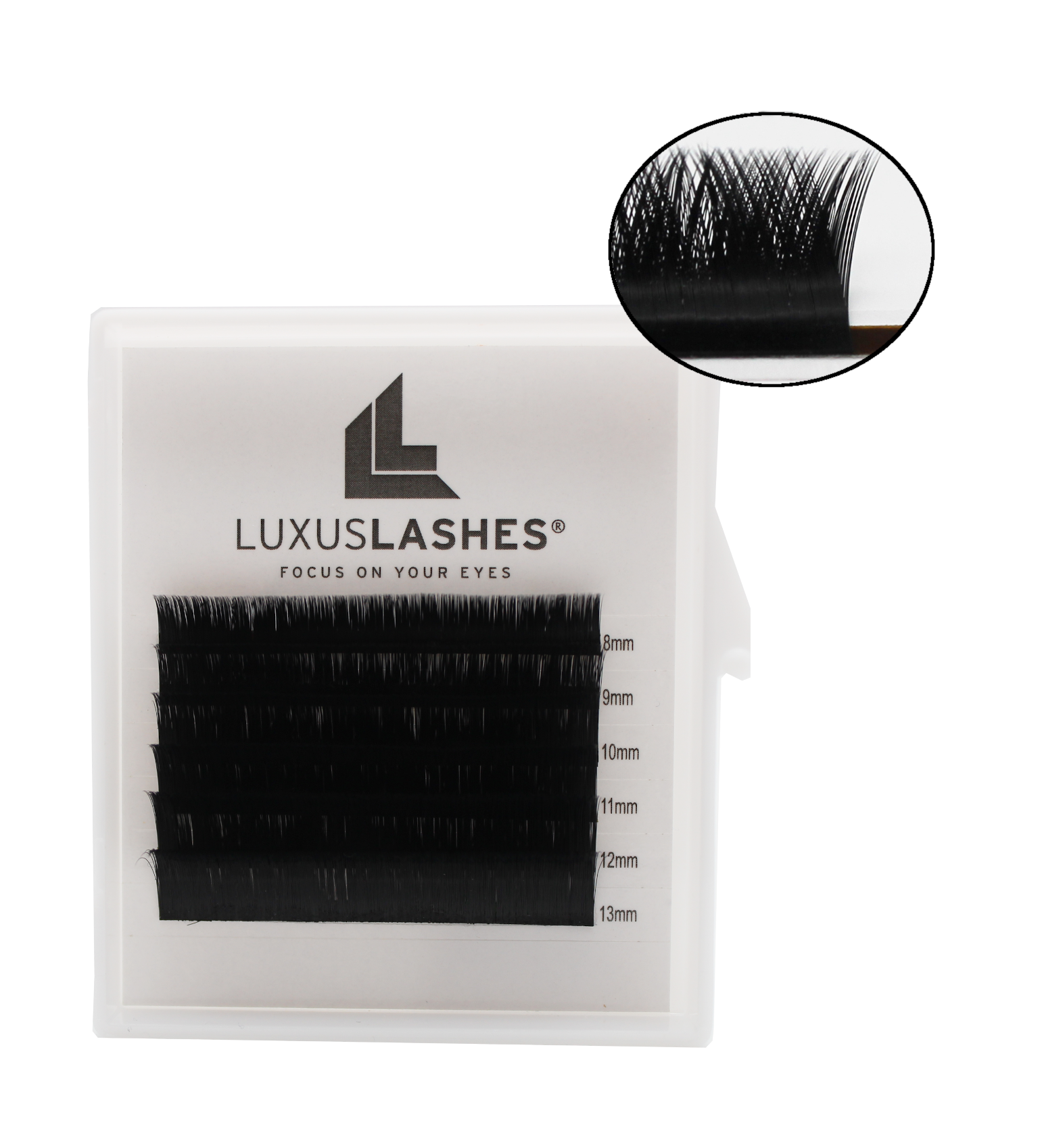 FOCONYES Wimpern von LUXUSLASHES® sind synthetische Wimpern, speziell für unsere Volumentechnik angefertigt. Sie sind extrem leicht, wunderbar weich und anwendbar für verschiedenste Volumen-Looks.Sie sind ideal zu fächern und direkt aus der Box heraus, fertig zum arbeiten. Dank unseres speziellen PBT-Materials sind unsere Wimpern so leicht wie eine Feder und dennoch perfekt stabil in ihrer Form. Ihre tief schwarze Farbe verleiht jedem Blick Intensität, während unsere Wimpern dank des innovativen Designs keine Kleberückstände vom Klebeband hinterlassen. Unsere Wimpernboxen wurden mit dem Blick auf Ihre Bedürfnisse entwickelt. Die perfekt weiche Box enthält 20 Reihen dichter Wimpern. Wir verstehen, dass Länge und Stärke von Wimpern nicht genormt sind und sich von Anbieter zu Anbieter unterscheiden. Daher benennen wir unsere Wimpern nicht nach Durchmesser, sondern nach Gewicht: Slim (ca.0,03-0,04)Light (ca. 0,05-0,06) Medium (ca. 0,07-0,09)Unsere Wimpernboxen sind nicht nur arbeitsfreundlich, sondern auch vielseitig und anpassbar.Die quadratischen Boxen ermöglichen es Ihnen, sich bequem am hohen Rand abzustützen, ohne die Wimpern zu beschädigen. Die Lash Cards bieten eine glatte, staubfreie Oberfläche, auf der heruntergefallene Wimpern problemlos wiederaufgenommen werden können, ohne lästiges Festkleben. Sie können die Boxen ganz nach Ihren Bedürfnissen anpassen, indem Sie eigene Boxen kreieren - die durchsichtigen Stripes lassen sich einfach mit einer Pinzette ablösen und mit Hilfe der Lash Cards zur eigenen Box zusammenfügen. Dank der ablösbaren Stripes können Sie den Inhalt Ihrer Box bis zu 8-mal vollständig aufarbeiten, was weniger Verschleißmaterial bedeutet. Die durchsichtige Hülle schützt die Wimpern vor Staub und ermöglicht Ihnen gleichzeitig ein klares Erkennen durch die Farbetiketten auf der Box. Bei der Entwicklung unserer LUXUSLASHES® Wimpernboxen haben wir an alles gedacht, damit Sie als Profi das beste Werkzeug für Ihre Arbeit haben. L-Curl ist perfekt für Kunden mit Schlupflid und kurzen Wimpern. Diese besondere Biegung ermöglicht kurze Wimpern aber ein noch sichtbarereres Ergebnis.