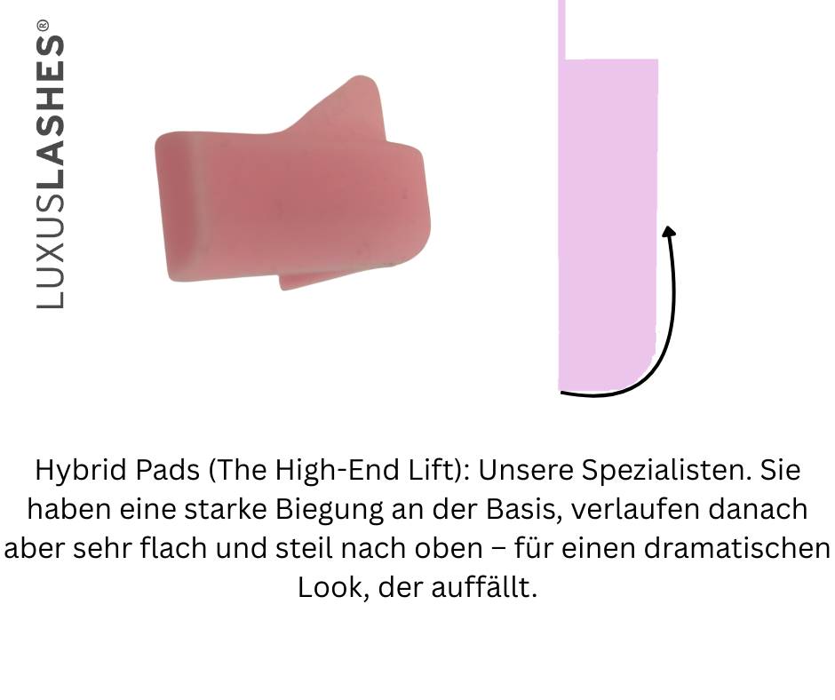Hybrid Pads (The High-End Lift): Unsere Spezialisten. Sie haben eine starke Biegung an der Basis, verlaufen danach aber sehr flach und steil nach oben – für einen dramatischen Look, der auffällt.